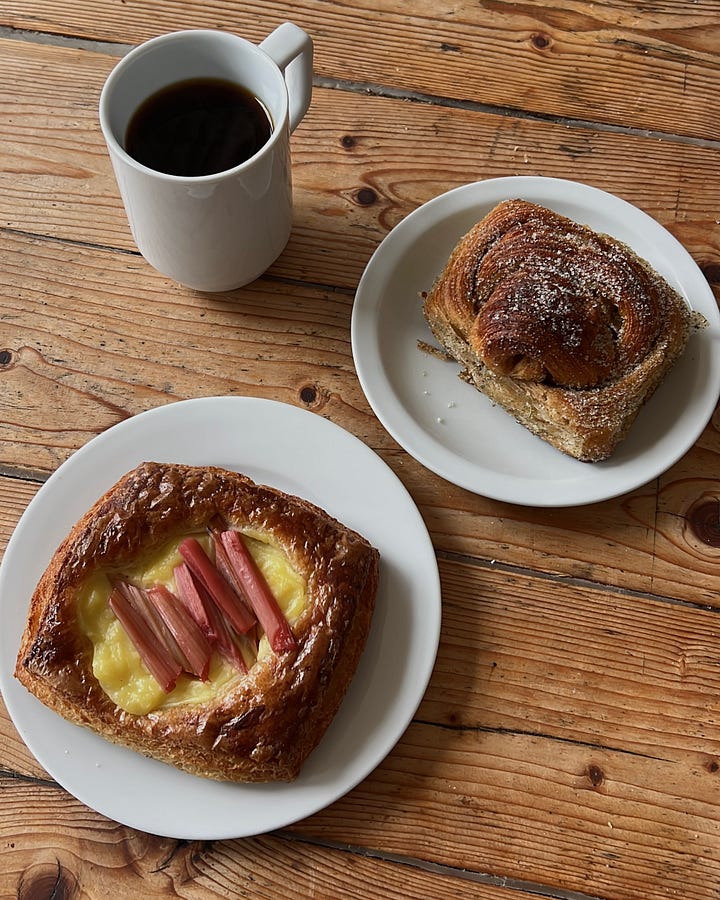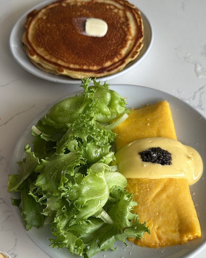 Sometimes it’s a well-executed French omelette and pancakes for the table. Sometimes it’s a a bagel with scallion cream cheese and half an açai bowl. Often it’s a really excellent pastry and a black iced coffee.